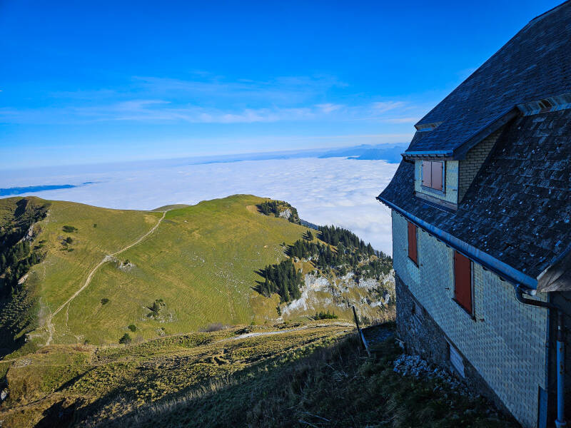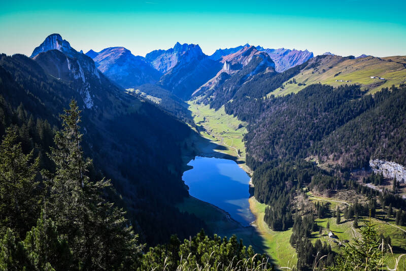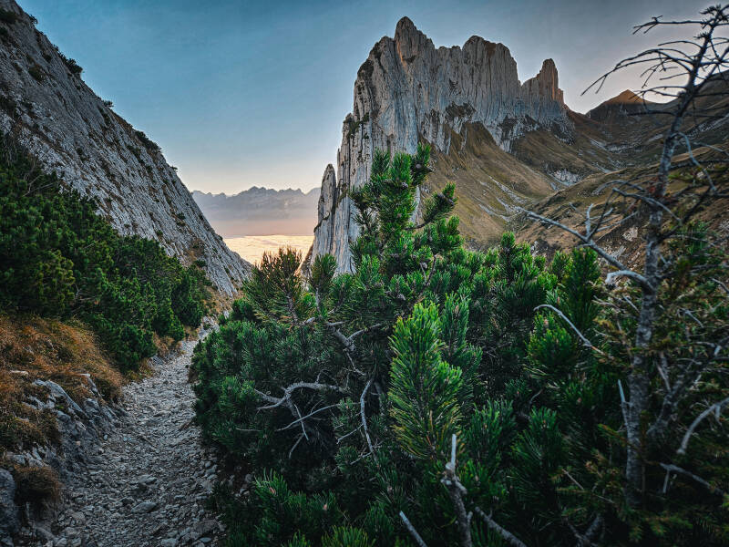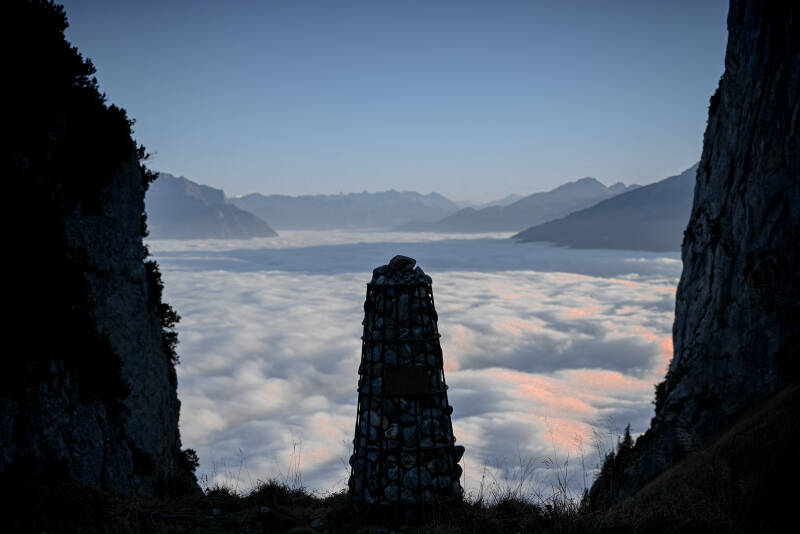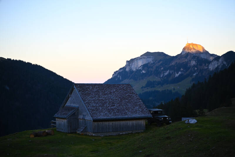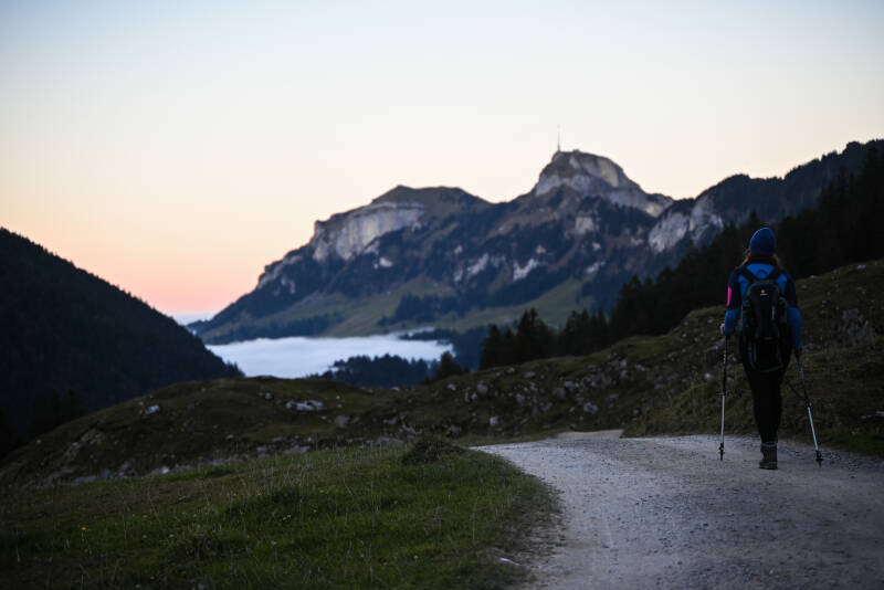 Der Weg schlängelte sich steil hinab und wir nahmen den Weg nach rechts Richtung Bollenwees - Brülisau. Nach einiger Zeit erreichten wir das Berggasthaus Bollenwees. Uns wurden empfohlen dort die Rösti zu probieren, aber leider waren wir dafür zu spät dran. Wir folgten den kürzeren Weg nach Brülisau und wanderten direkt in den Nebel hinein. Zuvor aber konnten wir die Sonne beobachten, wie sie langsam hinter den Bergen verschwand und sich der Himmel rosa färbte. Nach wenigen Minuten erblickten wir den Sämtisersee in seiner vollen Pracht. Nach gut 2,5 Stunden erreichen wir unseren Parkplatz. Die Sonne hatte dem Mond schon lange Platz gemacht und wir zum Glück Stirnlampen dabei. Der Abstieg war durch den steilen und dunklen Wald etwas langsam, aber wir kamen sicher unten an.