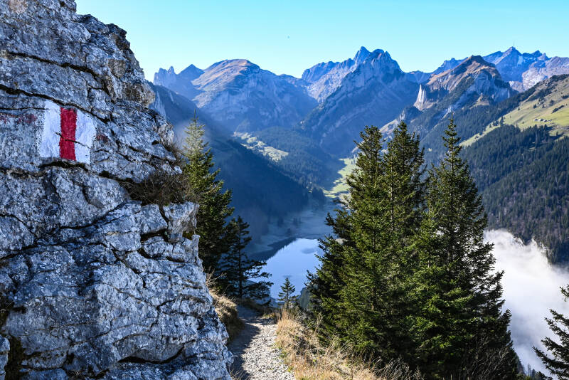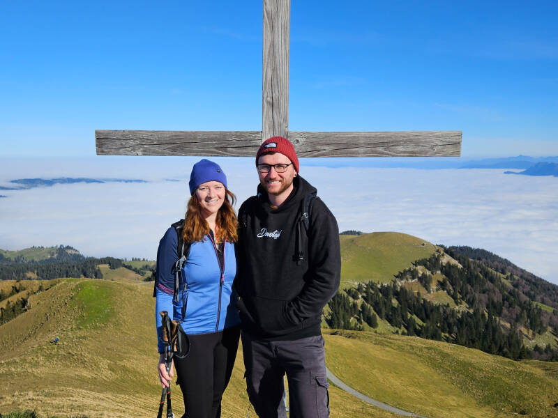 Natürlich durfte ein Foto mit dem Gipfelkreuz nicht fehlen. Anschließend ging es wieder ein Stück auf die alte Route zurück. Wir folgten den Schildern Richtung Staubern (oft auch mit Stauberen ausgeschildert). Was dann folgte war fantastisch - auf der rechten Seite konnte man immer wieder den Sämtisersee erblicken und die Weite des Alpsteingebietes genießen. Dies ging gut 2,5 Stunden so weiter - immer wieder bergauf und bergab den Panoramaweg entlang. Es lohnte sich einfach mal stehen zu bleiben und den Ausblick zu genießen. Zudem sollte man unbedingt eine gute Ausdauer mitbringen.
